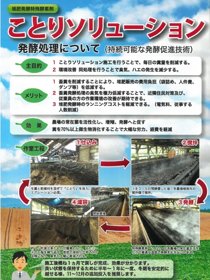 『ことりソリューション』は、農場の常在菌を活性化し、増殖、発酵へと促すことができる堆肥発酵特殊酵素剤です。
